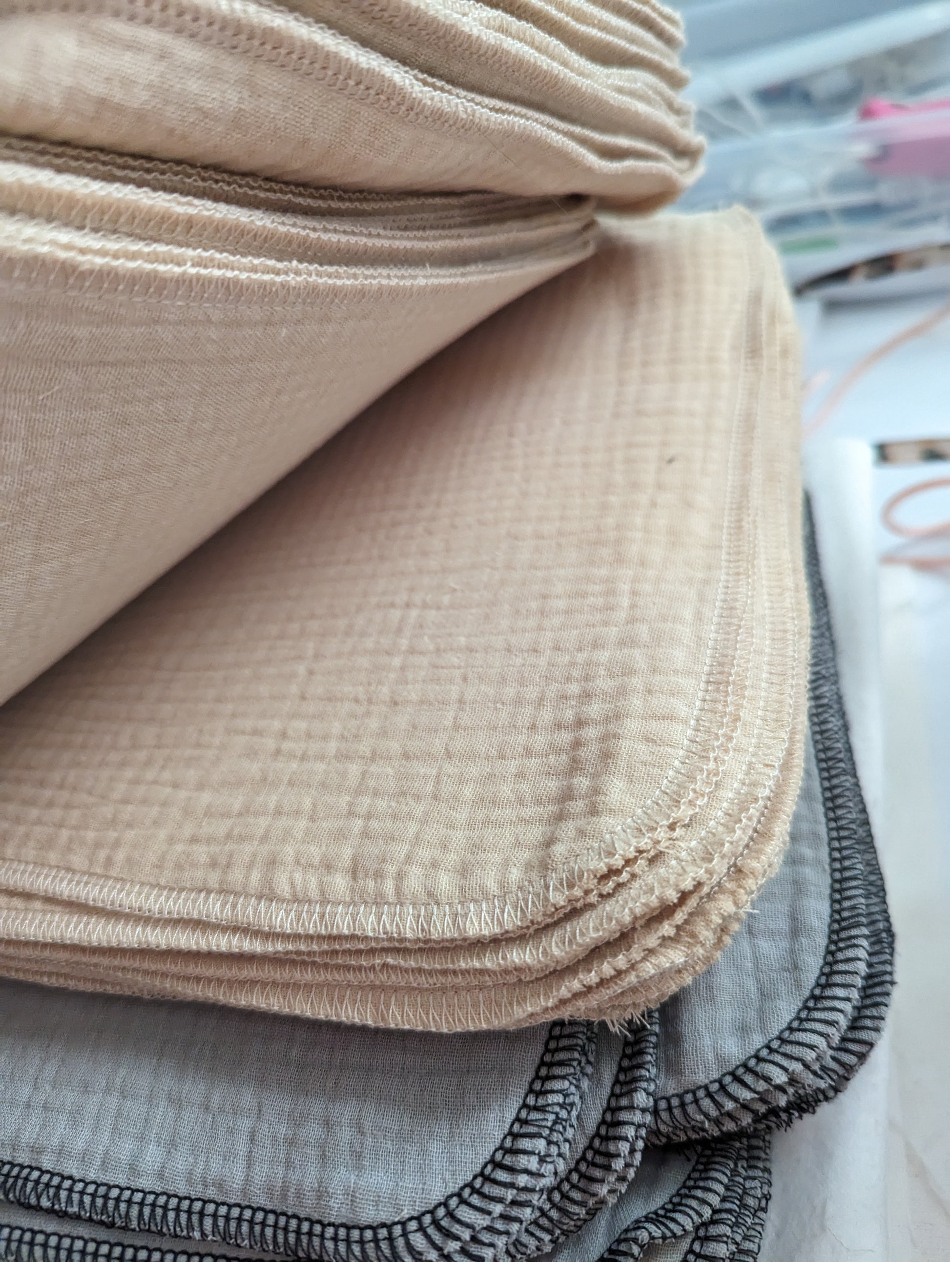 Two layers of super absorbent, luxuriously soft double weave muslin with coordinating tan thread.